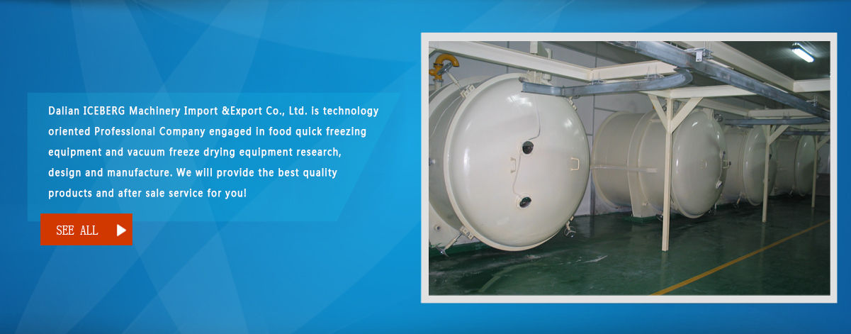 Dalian Iceberg Machinery Imp&Exp.Co., Ltd is specialized in the research, design and manufacture of the Vacuum freeze-dried equipment and food individual quick freezing equipment.